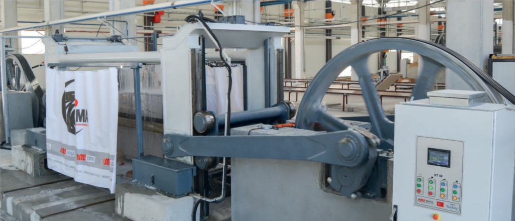 English: 50 Lama, with open frame system, is a machine that performs cutting. Its special cage body design enables the movement of the carriage on a low-pressure platform, eliminating vibrations during operation. This makes it very practical for cutting cracked and amorphous blocks. The lifting surfaces are processed in a symmetrical direction by a gear and screw placed on the vertical column. The cutting speed is regulated by a special reducer unit.